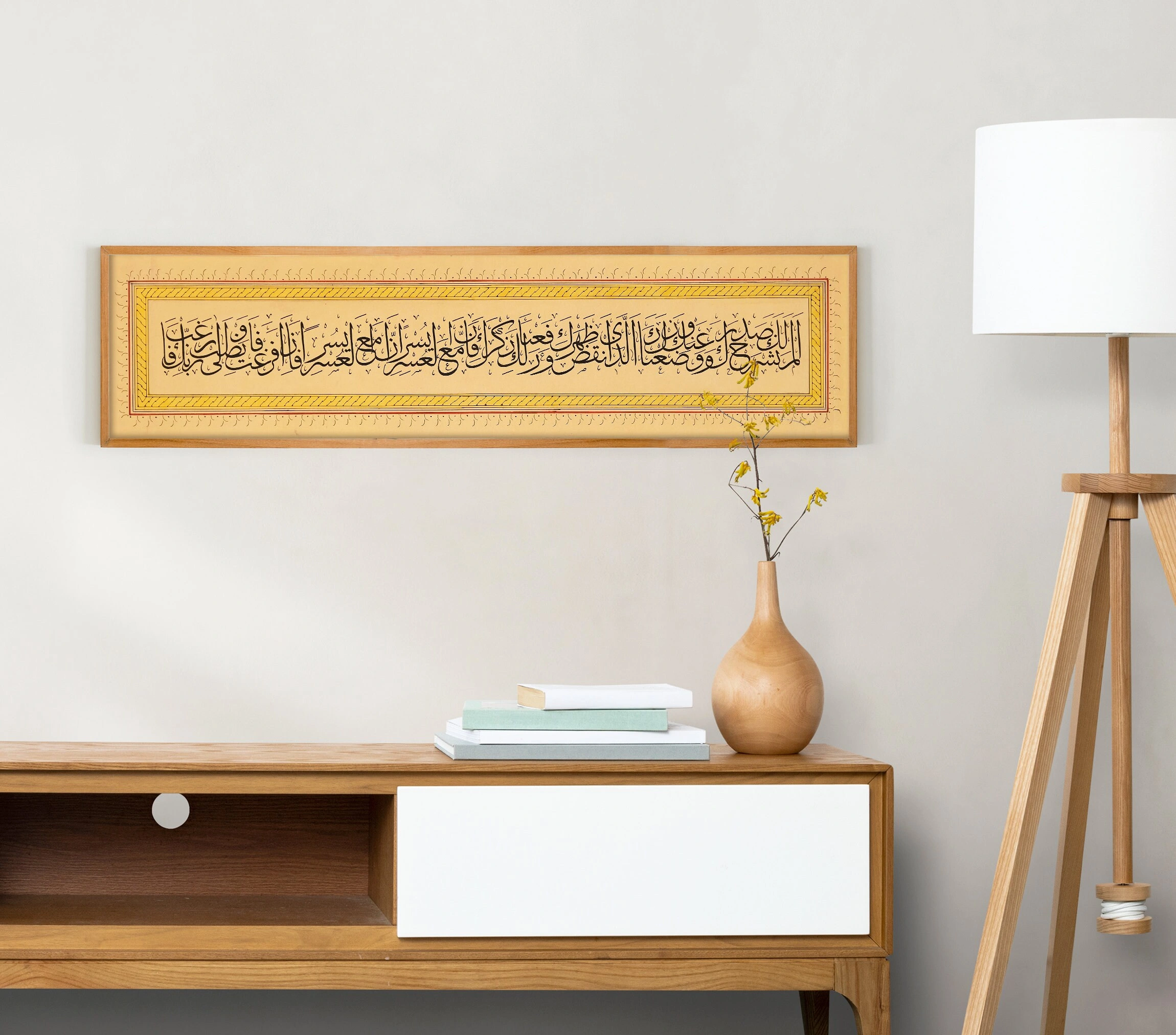 "Al Insirah" handwritten wall art by Turkish calligraphy artist Selma Altiparmak. Al Insirah manuscript calligraphy is completely handwritten with black inking over beige degraded paper. Great fit for bohemian Islamic home and office decorations. Modern Islamic wall decors are great gift ideas for Ramadan and Eid. Arabic calligraphy art and line art wall hangings can be used as Muslim home decorations.
