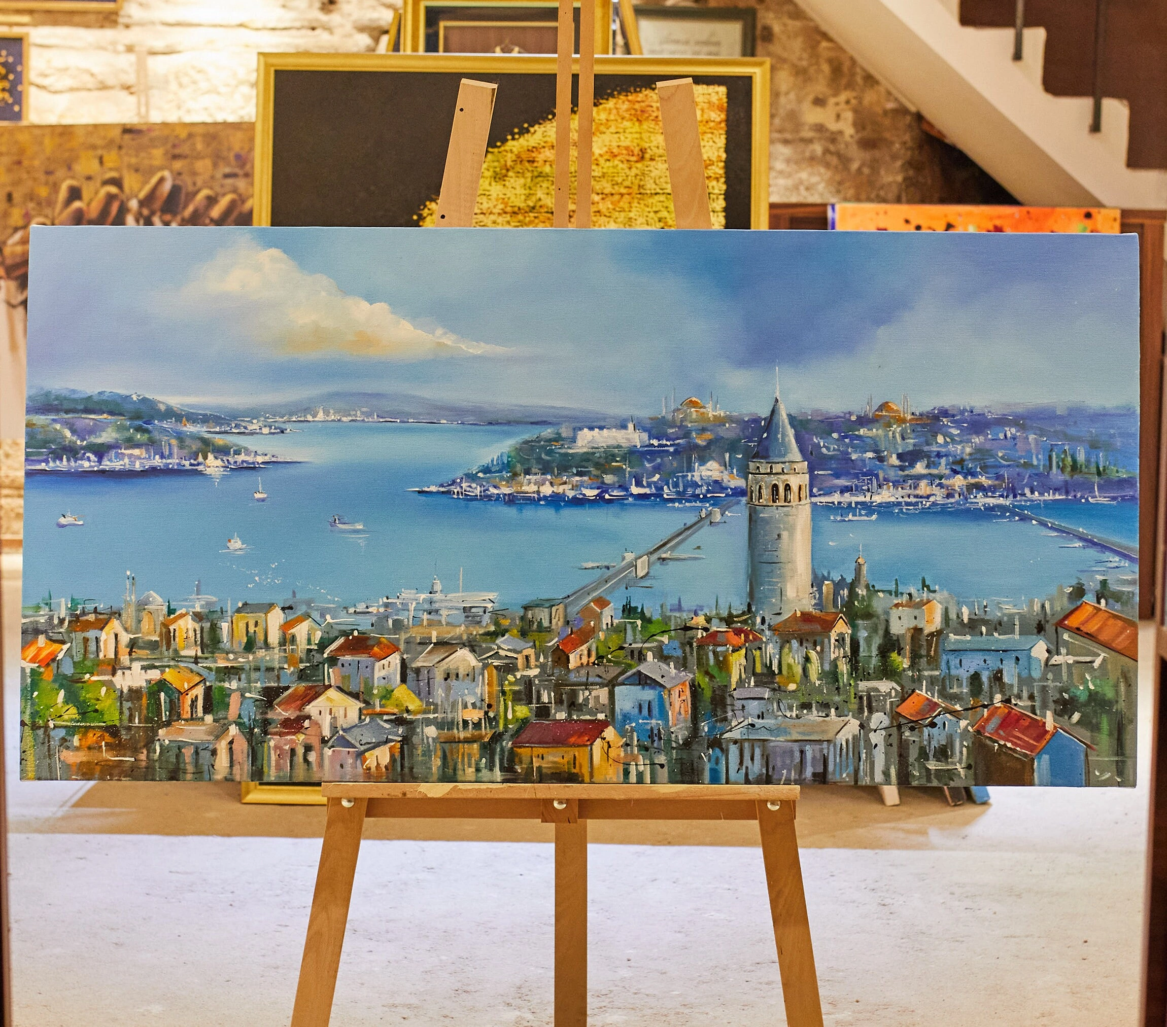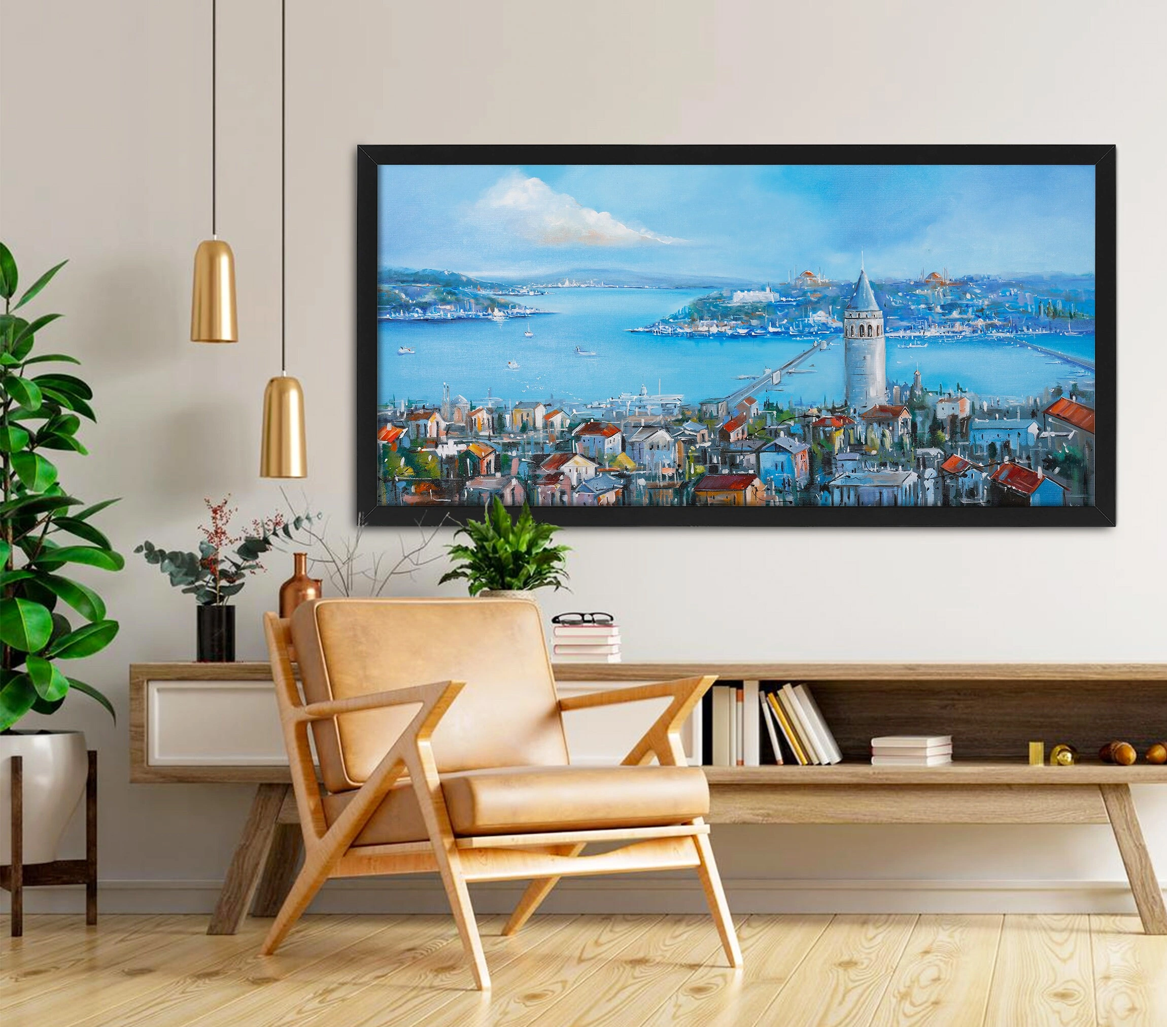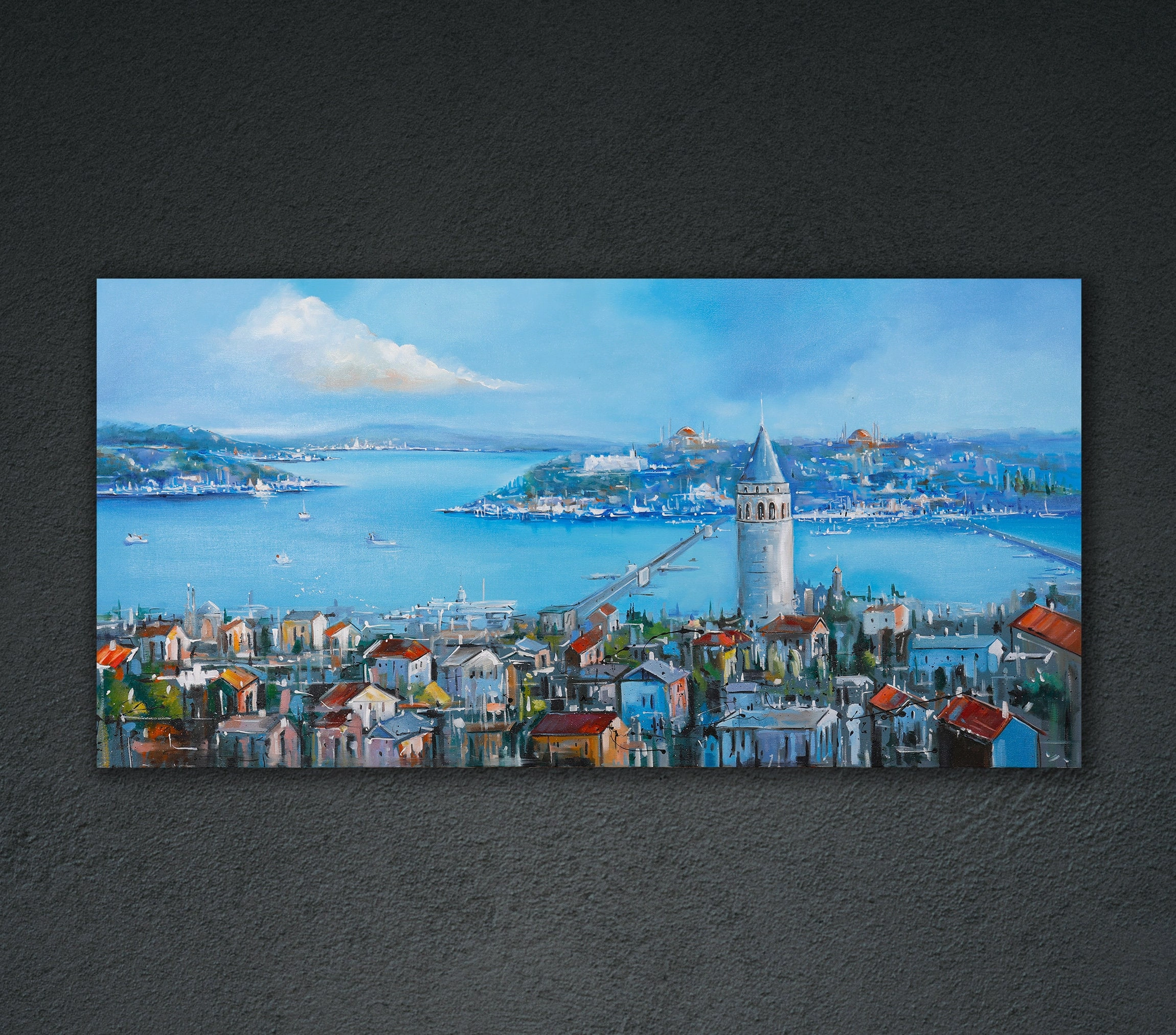 İstanbul'un görkemli Tarihi Yarımada manzarasını duvarlarınıza getiren duvar dekoru, ev ve ofis dekorasyonunuza değer katacak. Panoramik İstanbul manzaralı resim, tanıdık yapıları ve enerjisiyle İstanbul şehrinin güzelliğini çarpıcı manzarada buluşturuyor. Yumuşak renkler ve mavi ağırlıklı tonlar yatıştırıcı bir etki verirken, sizlere de hareketli İstanbul şehrinin anlatılmamış hikayelerini anlatır. Işık ve gölge kullanımı eseri dengeleyerek, bakışları İstanbul silüetinin ikonik mimarisine çekiyor. Her istediğinizde, İstanbul'un güzelliğine ve ihtişamına kendi ambiyansınız rahatlığında tanık olacaksınız. Bu benzersiz parça, modernden klasiğe dekor temanız ne olursa olsun her dekorasyon stilini tamamlayacak. Bu harika şehir manzarasını, İstanbul sokaklarının bir hatırası ve şehre bir saygı duruşu olarak salondan oturma odasına, mutfağa, ofise veya koridora kadar evinizin herhangi bir odasında sergileyebilirsiniz. El yapımı bu orjinal sanat eseri ile İstanbul şehrini evinize getirin. Bu etkileyici tuval sanatı, şehirde olmasanız bile İstanbul'un dikkat çekici şehir manzarasının tadını çıkarmanıza izin verecek.