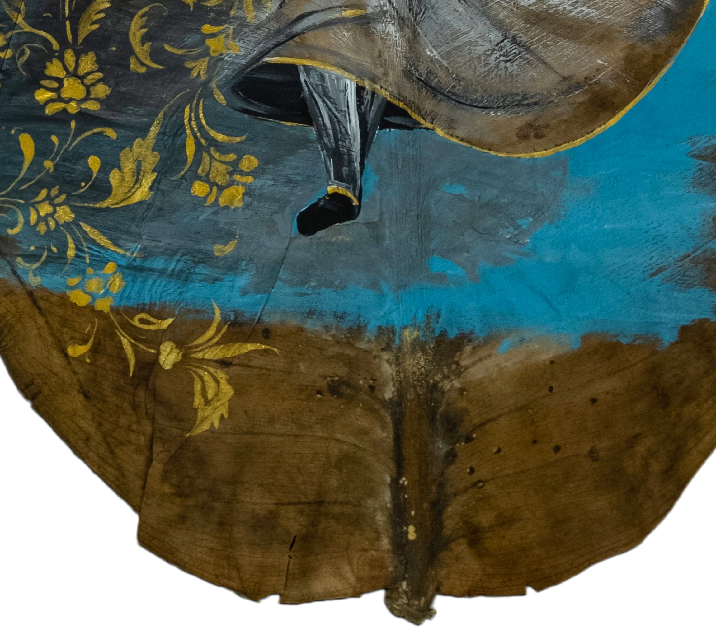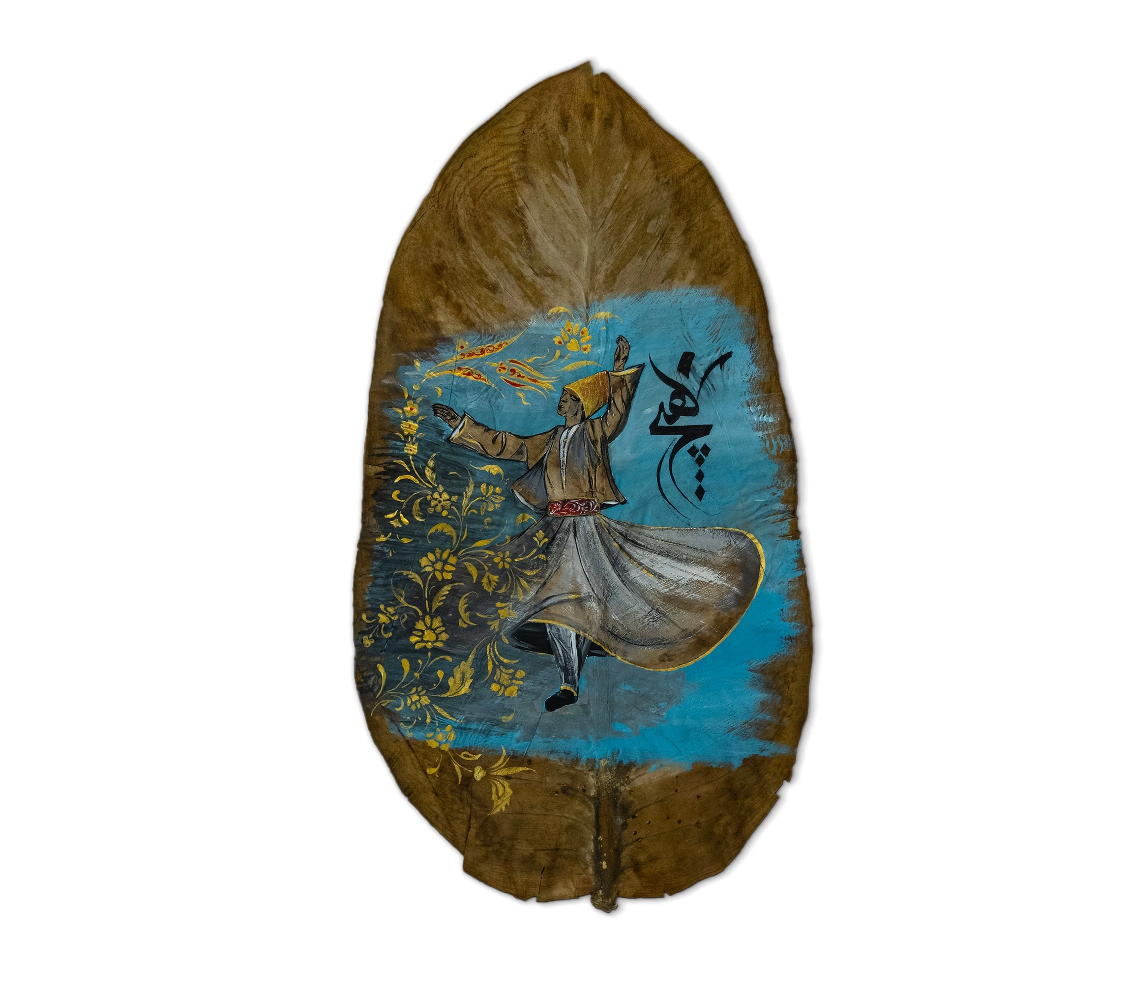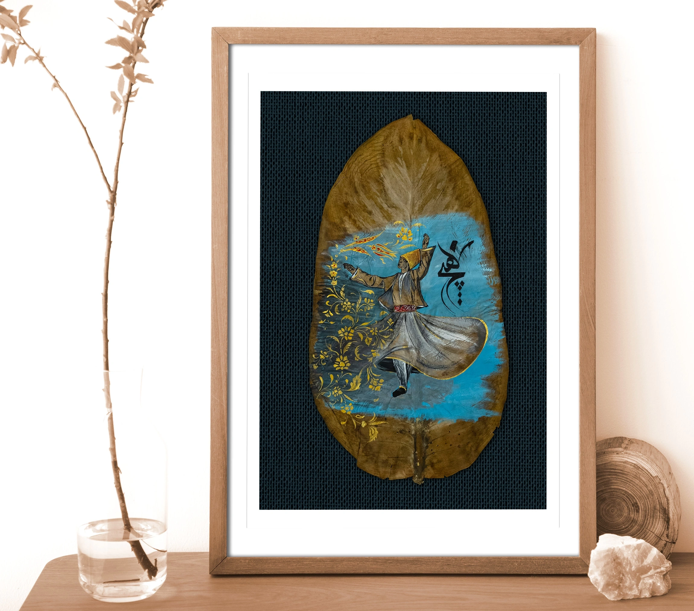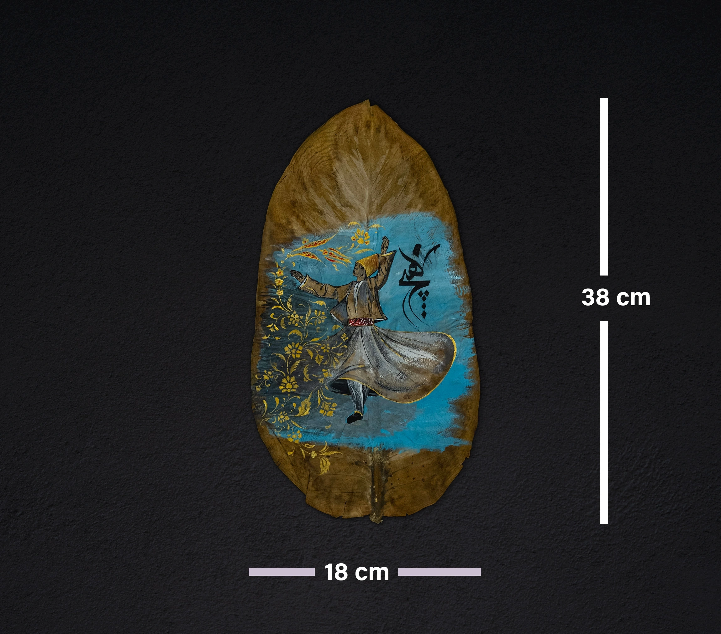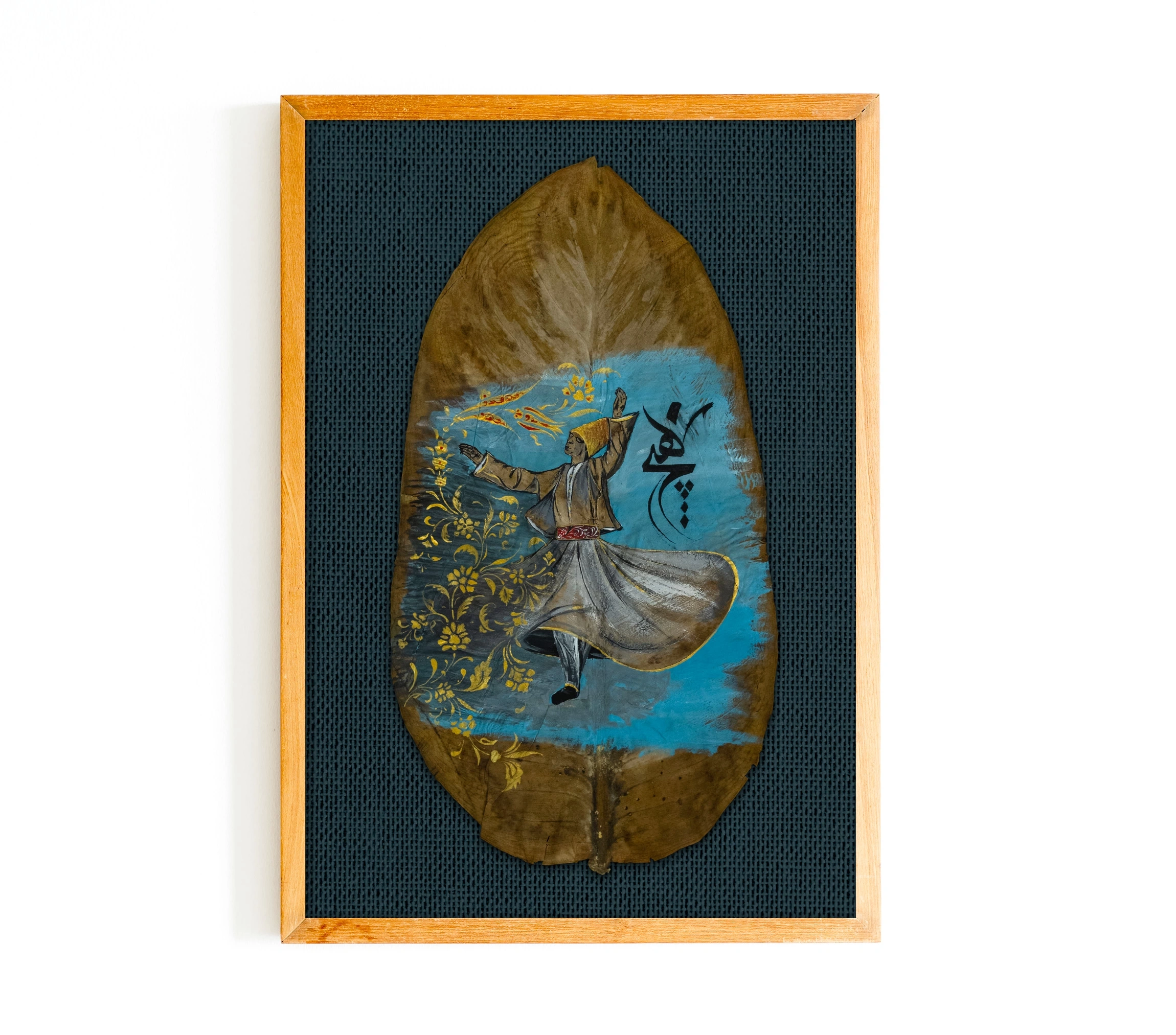 Whirling dervish leaf art is an amazingly designed Islamic art where a sufi semazen figure is featured decorated with golden flowers. Decorated with Ottman Illumination art, this hand crafted Mevlana leaf art is made on a real maple leaf to bring spiritual vibes to your interior decor.