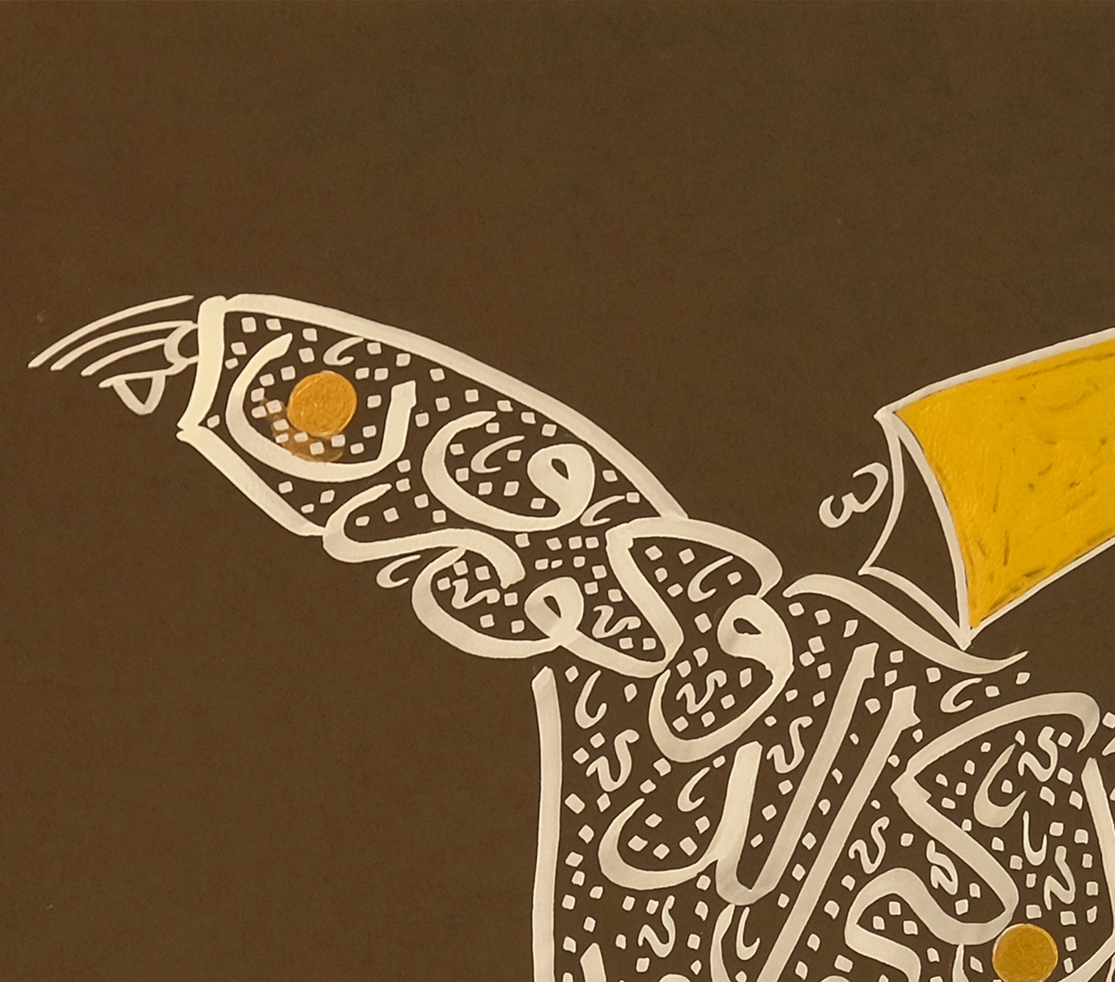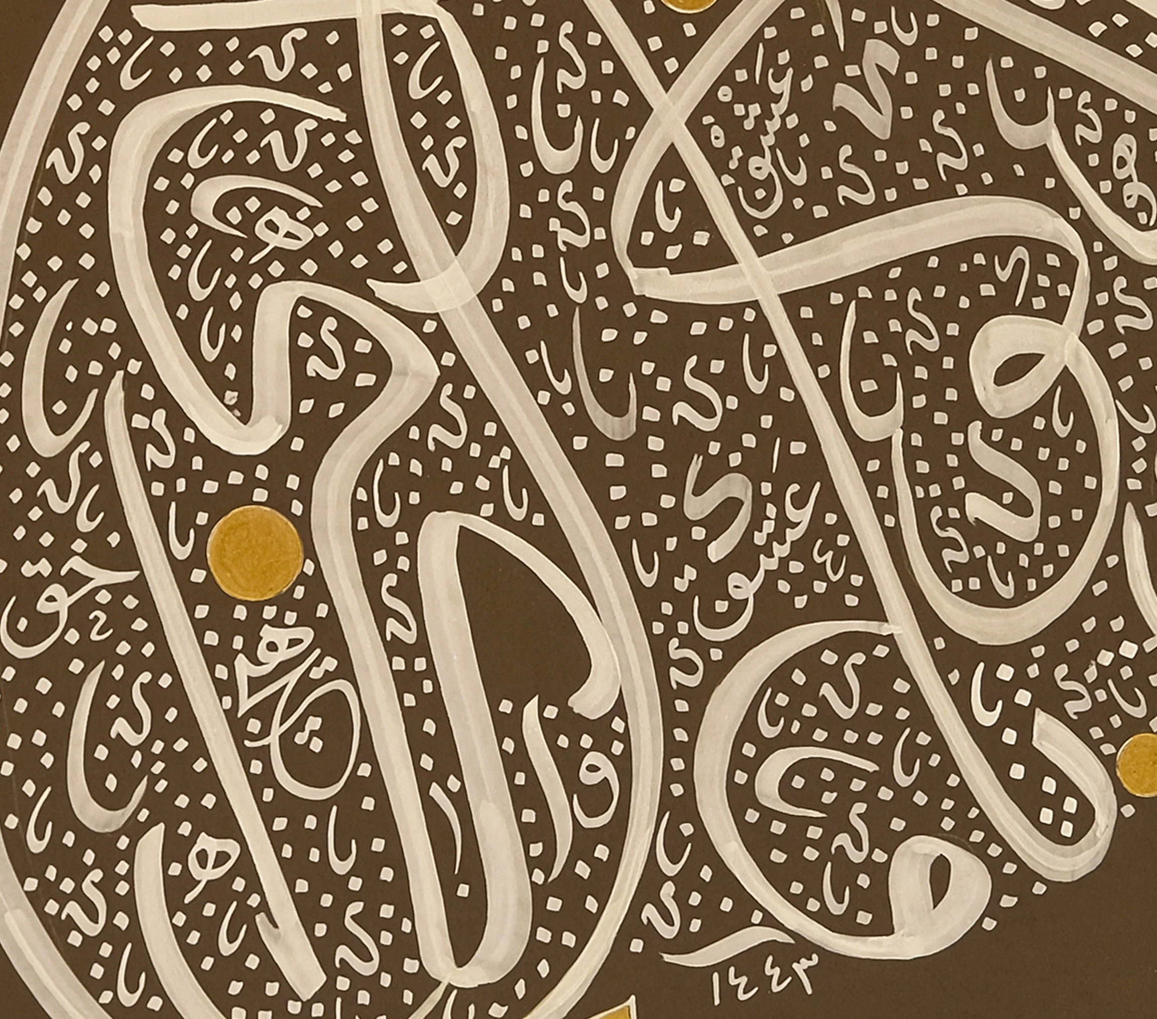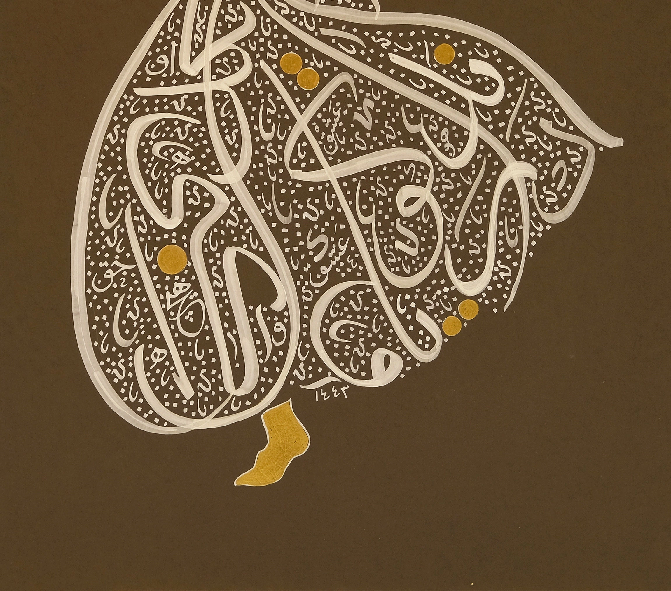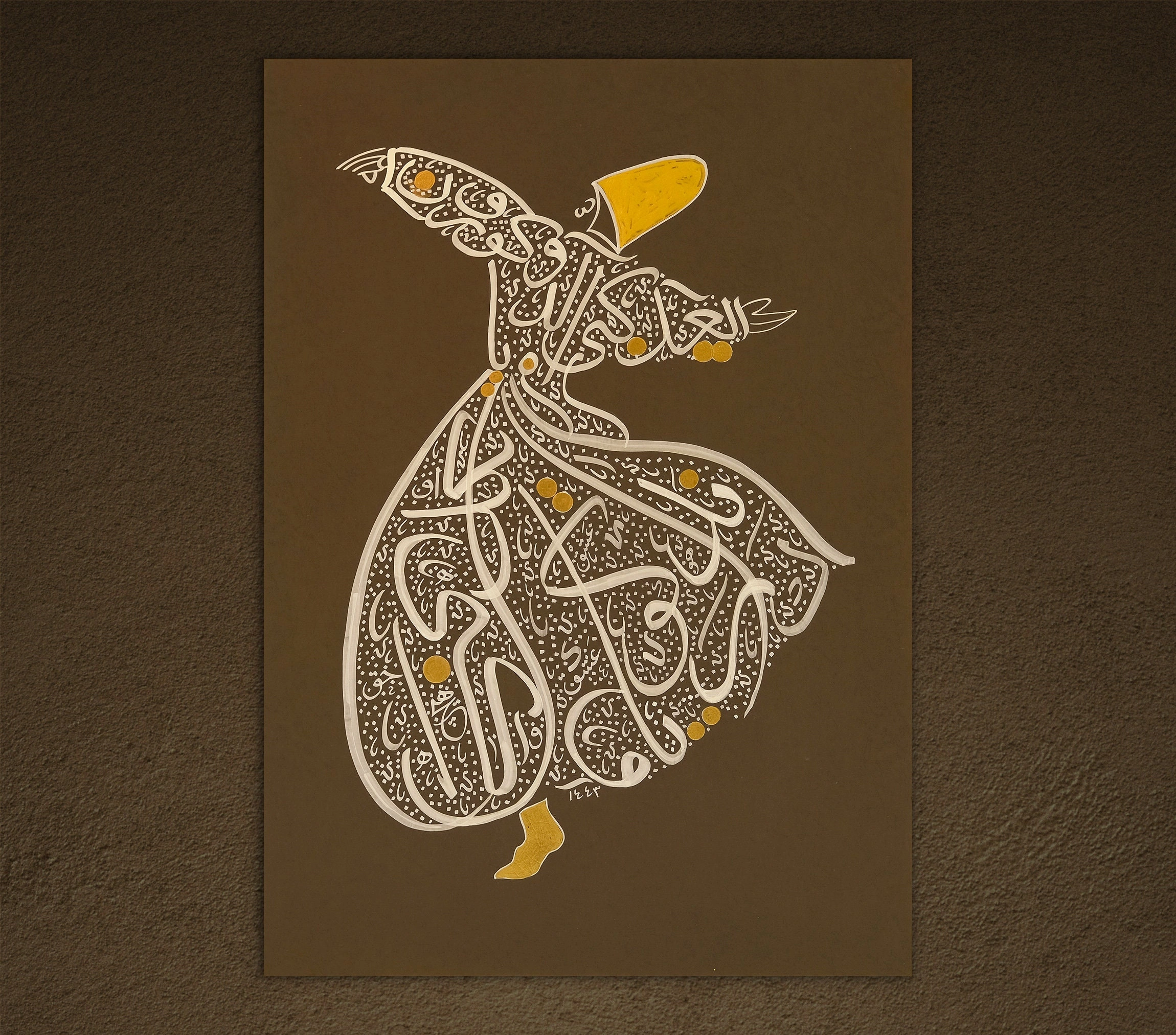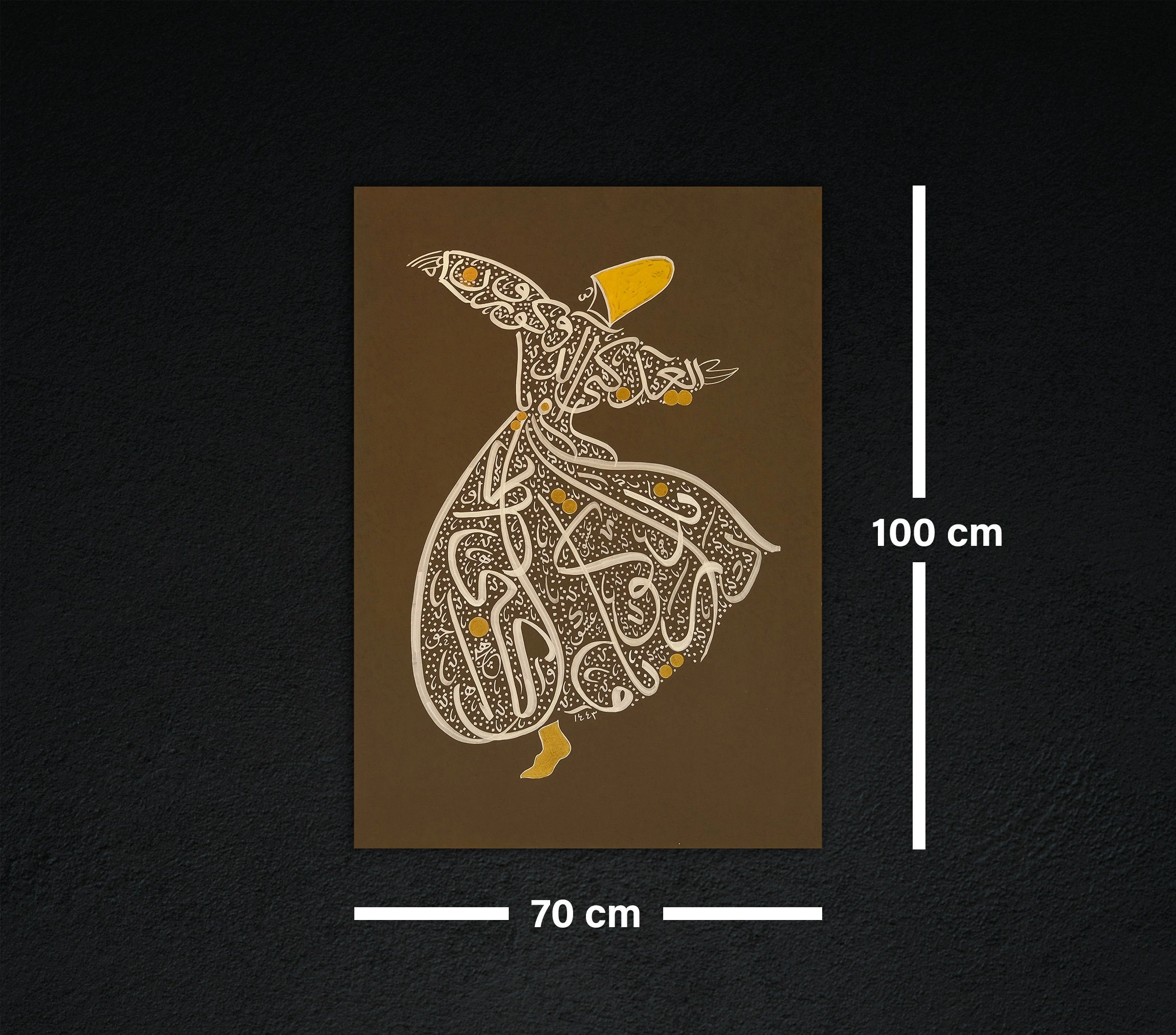 "Mevlana" wall art by Turkish calligraphy artist Selma Altiparmak. Rumi canvas art is white inking over brown paper with golden motifs. Arabic wall decor depicts a whirling dervish made of Arabic letters. Handwritten Islamic wall decor measures 27 by 39 inches. Handmade calligraphy arts are great gift ideas for Ramadan Mubarek and Eid. Arabic calligraphy art style and Kufi wall arts can be used as a Muslim home and office decorations.