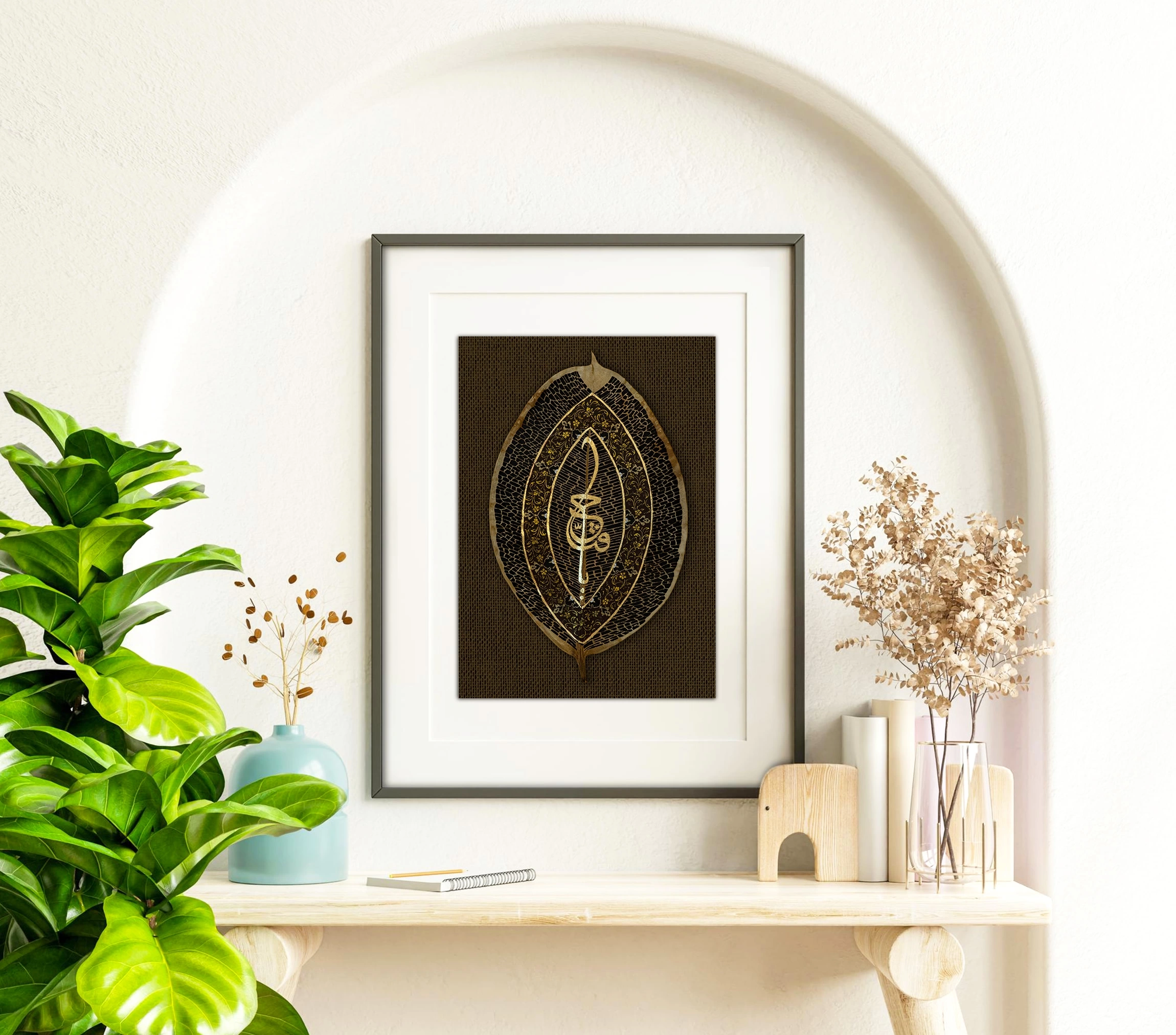 Notable for its simple yet impressive design, Ya Fettah leaf art is the perfect choice for adding divine and unique vibes to any home. Handmade leaf art features masterful calligraphy skills of verses from the Holy Quran all hand-written on real rubber plant leaf, also known as Ficus Elastica. Leaf art is decorated with miniature art. This timeless artwork is the perfect addition to any Islamic decoration, lifting the ambiance as well as evoking a powerful message of serenity and wisdom.