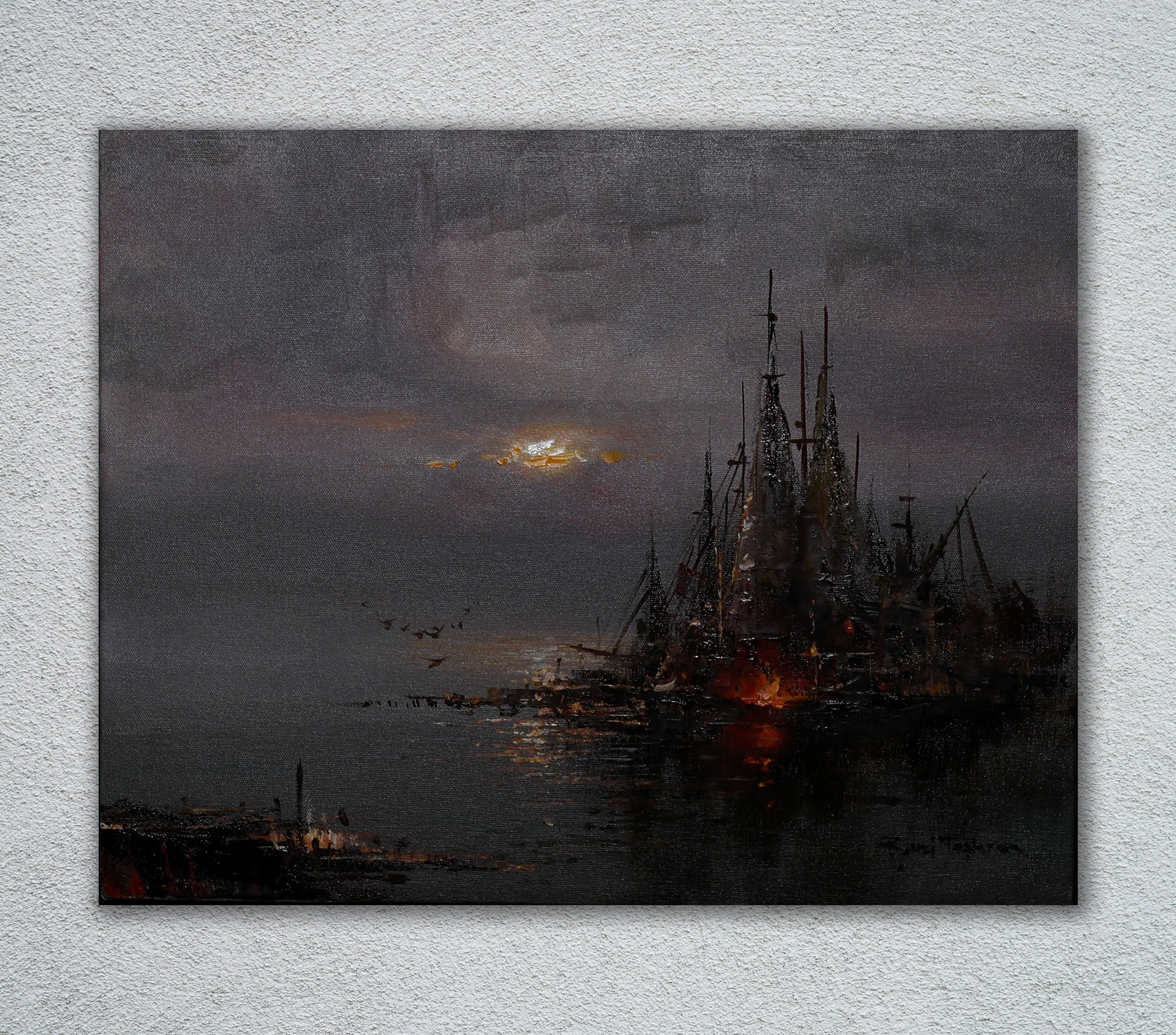 • İstanbul'da Tekneler Kanvas Tablo Tuval Üzeri Yağlıboya Deniz Manzarası Resmi Hediyelik Ev Eşyası Mavi Renkli Tablo