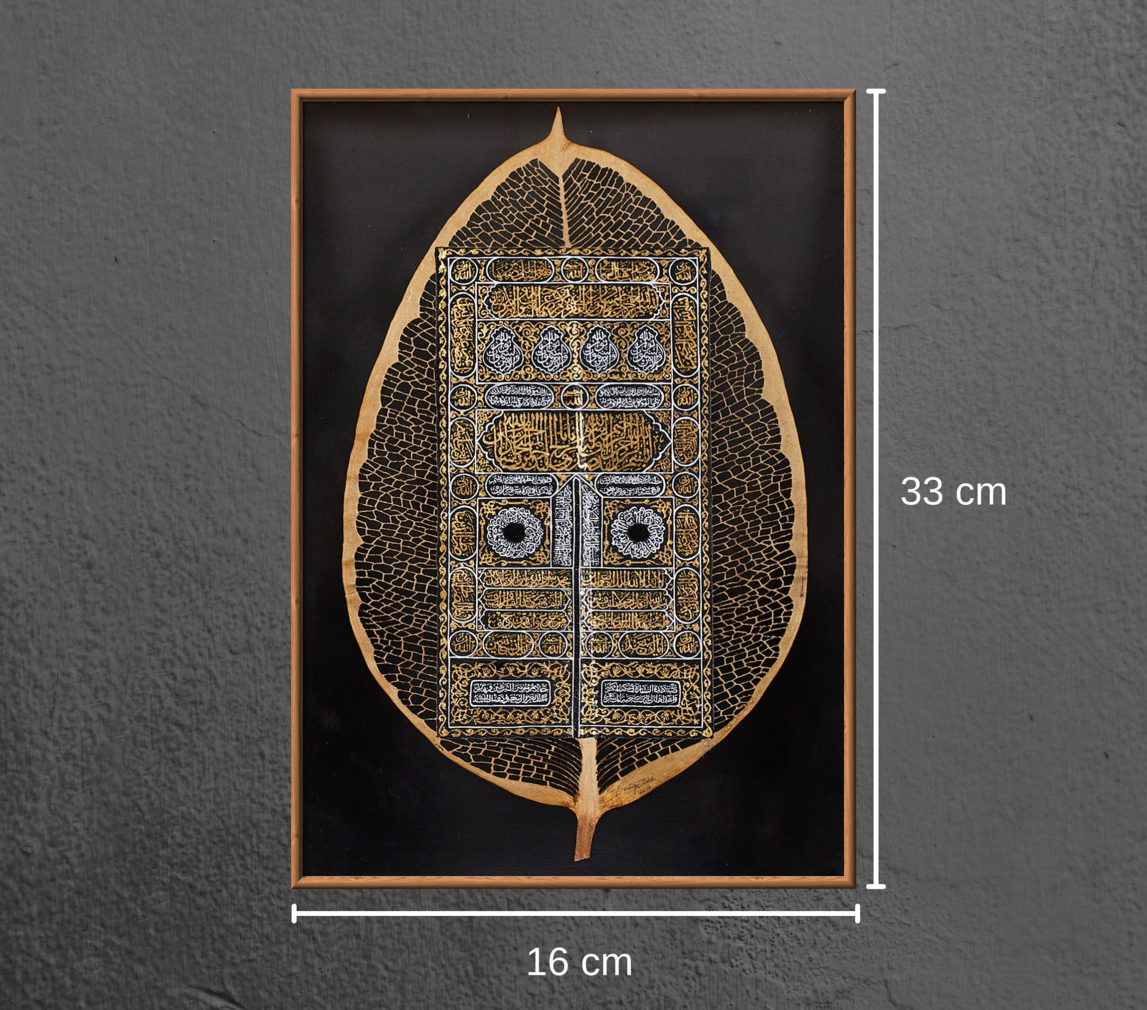 Göz alıcı altın renklerde hat süsülemesiyle Kabe Kapısı yaprak sanatı, her eve ilahi ve benzersiz hisler eklemek için mükemmel seçimdir. Usta işçilik gerektiren detaylı tasarımıyla Kabe Kapısı yaprak sanatı sofistike bir İslami ev dekorudur. Bu özel eser sergilendiği her ambiyansta kendinden söz ettirmeyi başaracak. Özenle elde üretilmiş bu İslami dekor sanatı, onu gören herkesin dikkatini çekecek şık detaylı bir hat süslemesiyle minyatür sanatının güzel bir birleşimine sahiptir. İslami duvar sanatı koyu renkler ve altın renkler kullanılarak akriliklerle boyanmış girift bir tasarıma sahiptir. Arapça kaligrafi yaprak eseri, ambiyansınızda kesinlikle bir konuşma başlatıcı olacak benzersiz ve özel bir parçadır. Zamansız ve modern bir duvar dekoru arayanlar için mükemmel seçim olan bu duvar sanatı sadece güzel ve zarif olmakla kalmıyor, aynı zamanda da anlamlı ve ruhani bir mesaj taşıyor.