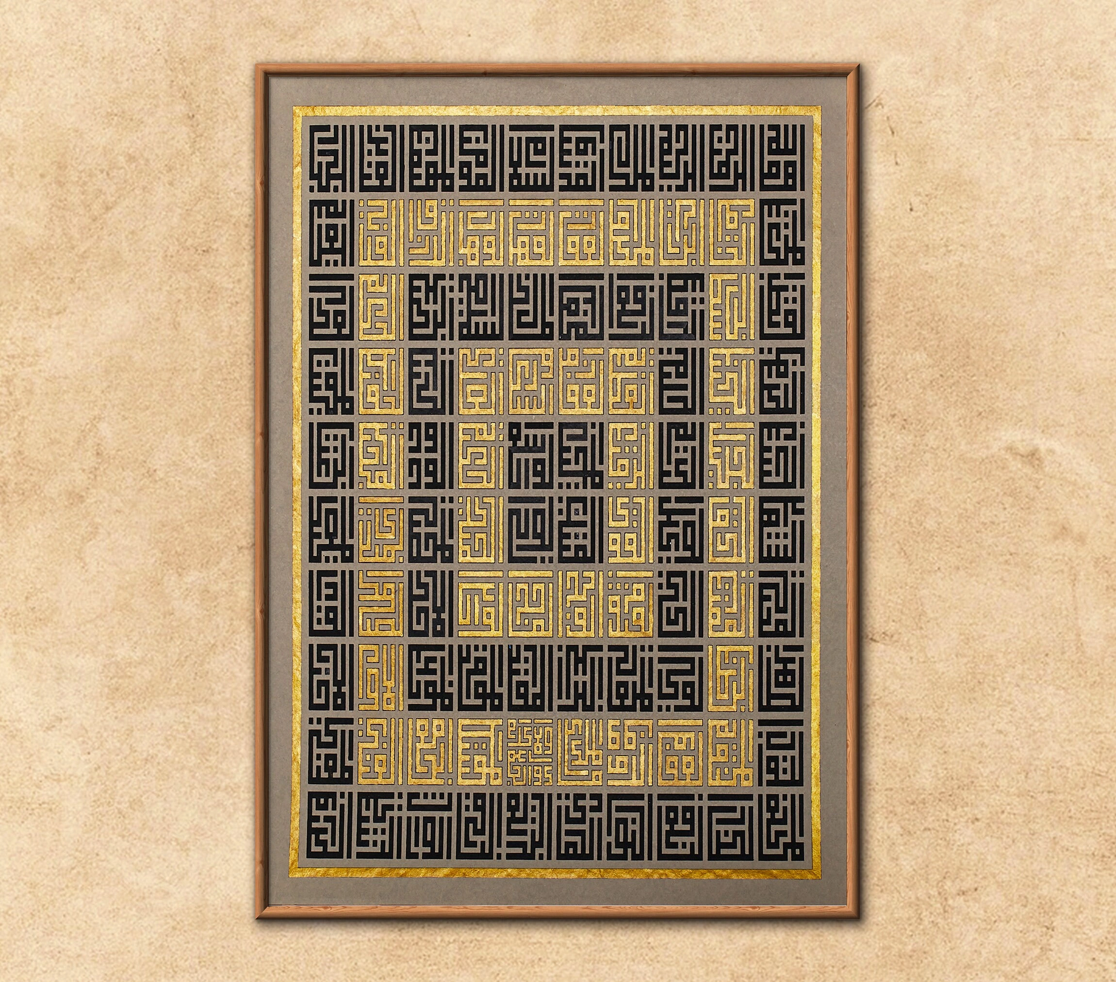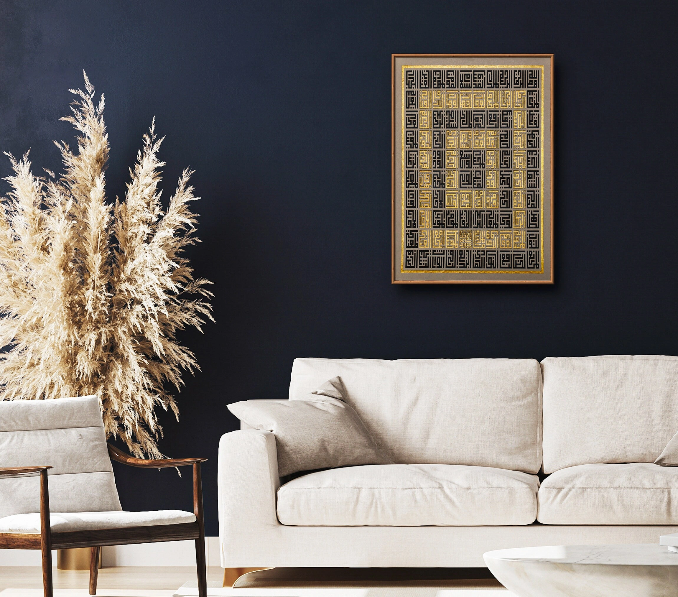 El yapımı doğal kağıt üzerine Arapça kufi hat sanatıyla yazılan Esma Ül Hüsna altın varak detaylı tablo göz alıcı tasarımıyla evinize hoş bir dokunuş katacak. Ambiyansınızı canlandırmak için anlamlı ve güçlü bir İslami duvar sanatı arıyorsanız, bu el yazması Esmaül Hüsna eseri yeterli olacaktır. Allah'ın 99 İsmi'nin yazılı olduğu bu değerli İslami hat eseri sergilendiği duvarlarda bir güven ve huzur atmosferi yaratır. Bu eşsiz ve çarpıcı Arapça kaligrafi her koleksiyona mükemmel bir katkı olacaktır. İster bir hediye seçeneği olsun, isterse İslami bir ev dekor stilini zenginleştirmek için olsun, Esma Ul Hüsna'nın alanınızı güvence altına alan gücünü hissedeceksiniz.