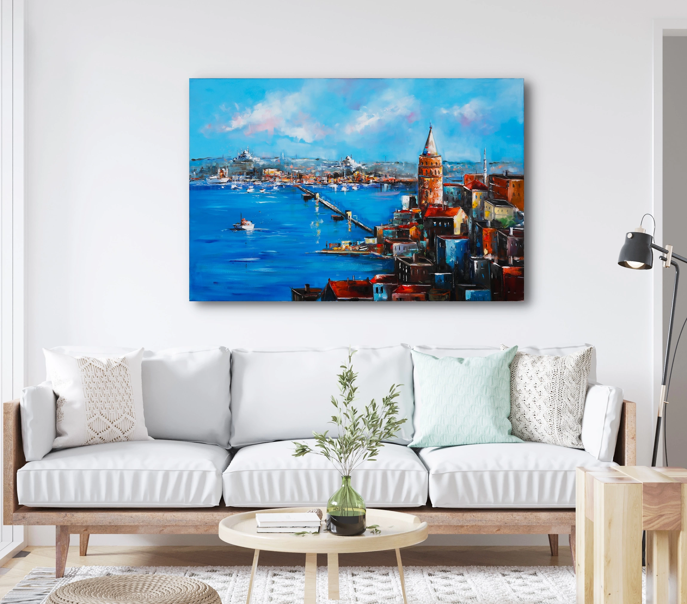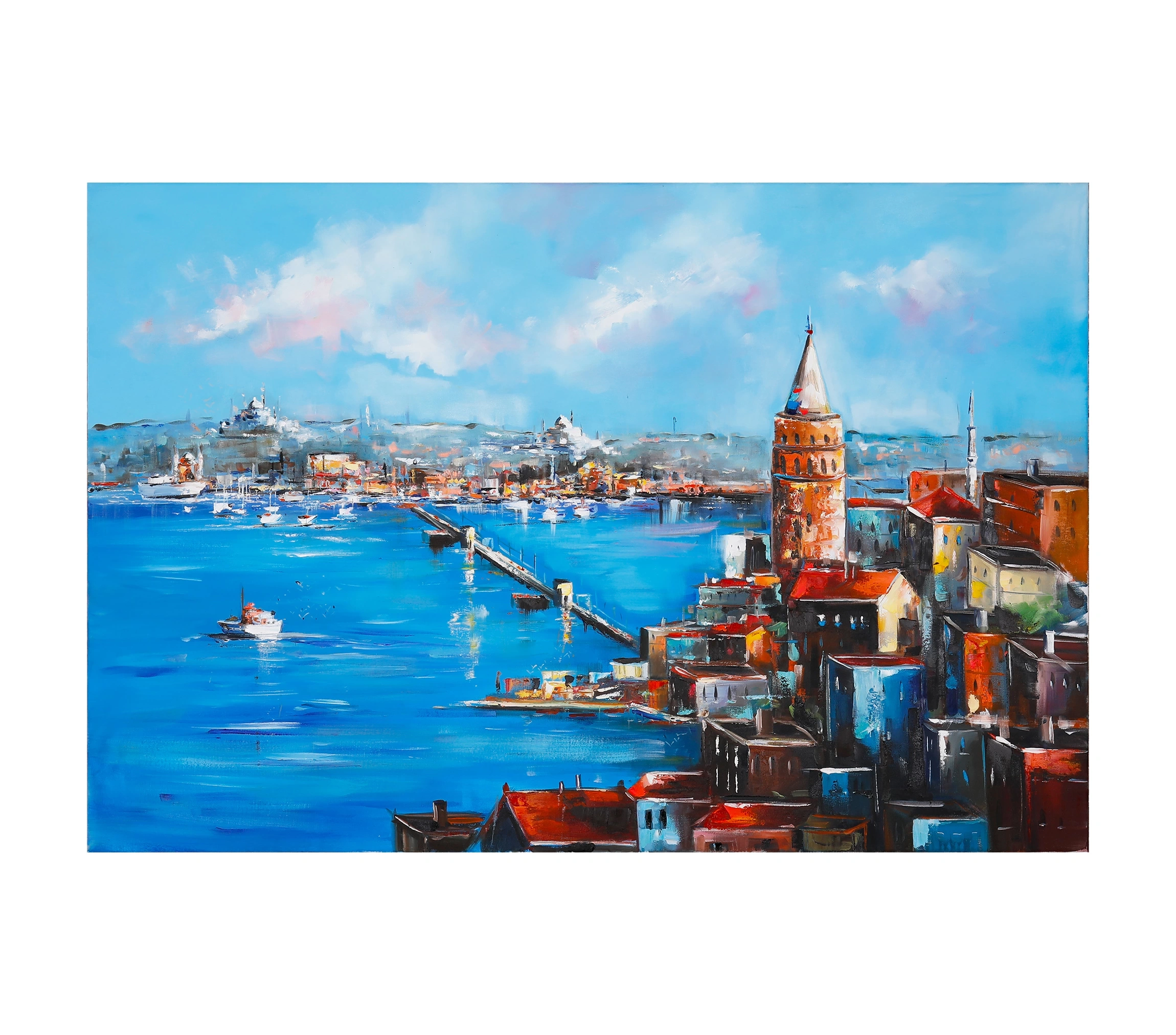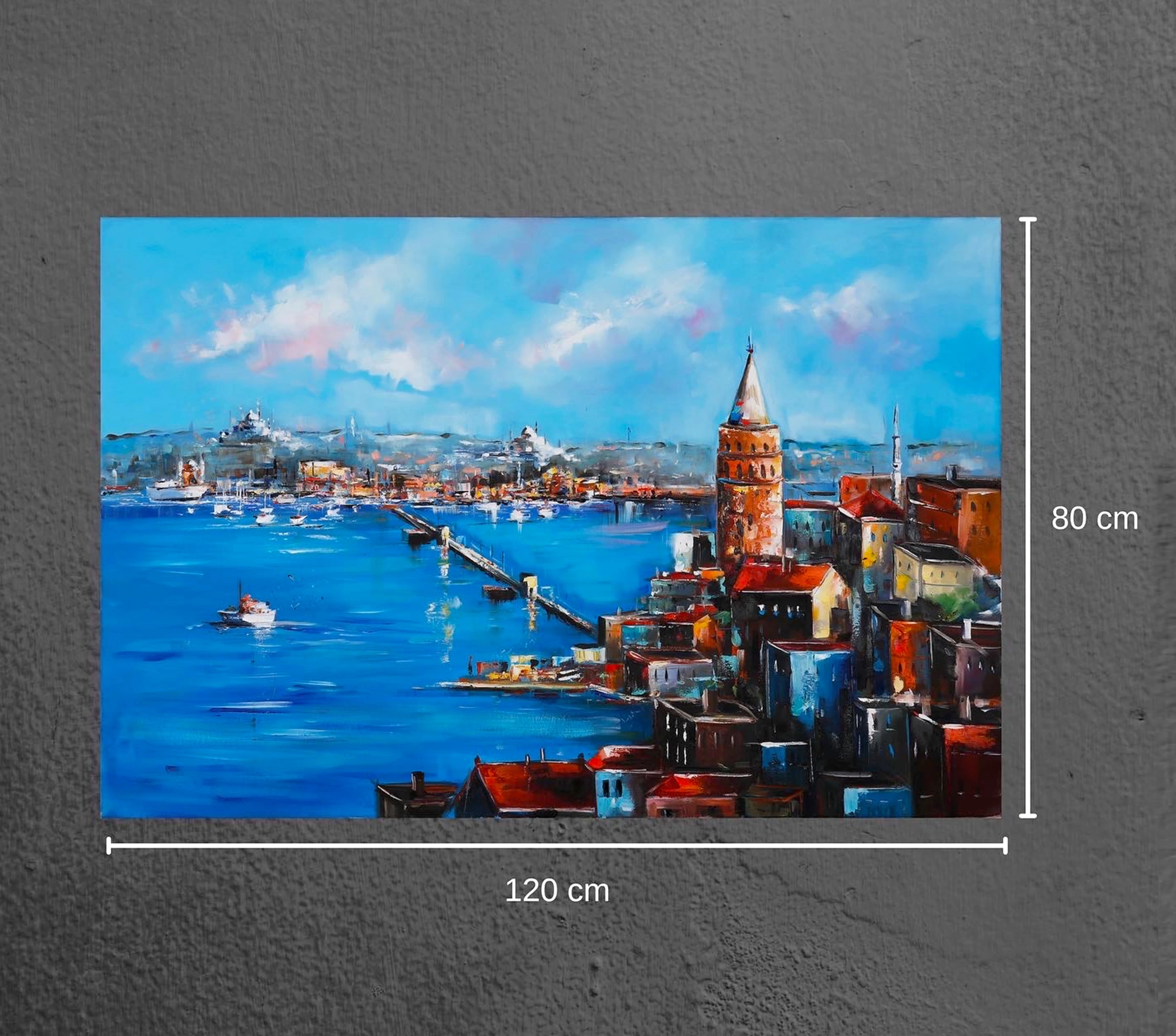 Çoğu kişiye göre dünyanın en güzel şehirlerinden biri olarak kabul edilen ve uzun ve zengin bir tarihe sahip İstanbul şehrinin ikonik sembollerinin şık bir tasvirini yapan "Mavi Galata" kanvas tablosu, mavi tonların ağırlıkta olduğu canlı renkleri ve enerjik tasarımıyla İstanbul'un benzersiz güzelliğini sergiliyor. Tarihi Yarımada manzaralı bu İstanbul temalı tablo tuval üzerine yağlıboya yapılmış olup detaylara gösterilen özenin, herkes tarafından takdir edilmesi adına ustalıkla hazırlanmıştır. Bu muhteşem panoramik İstanbul manzarası, şehrin kendisi gibi canlı maviler ve sıcak tonlardan oluşan hoş bir renk paletine sahiptir. İstanbul tablosu, her odaya güzellik ve kültür dokunuşu katacak etkileyici bir sanat eseridir.