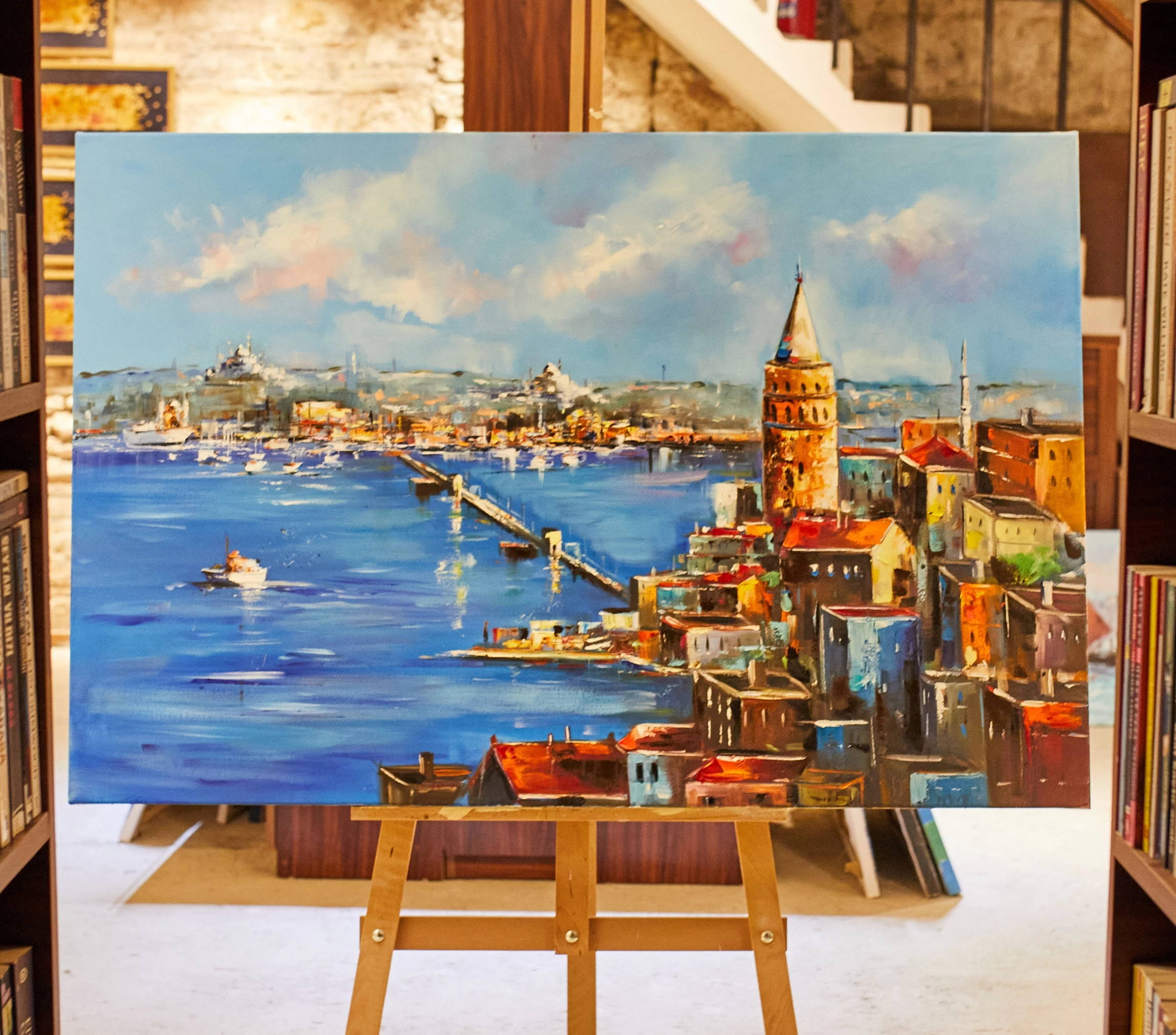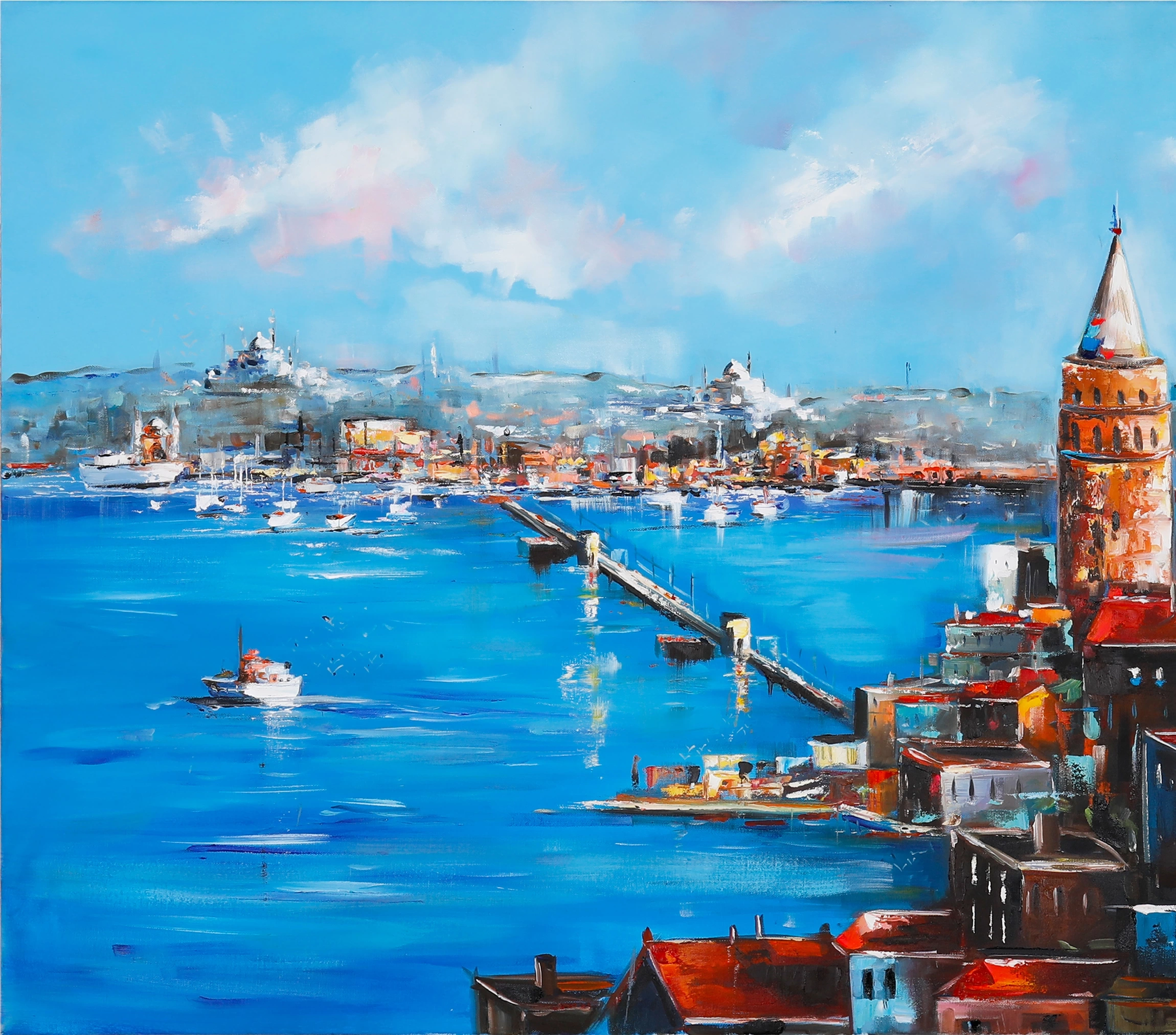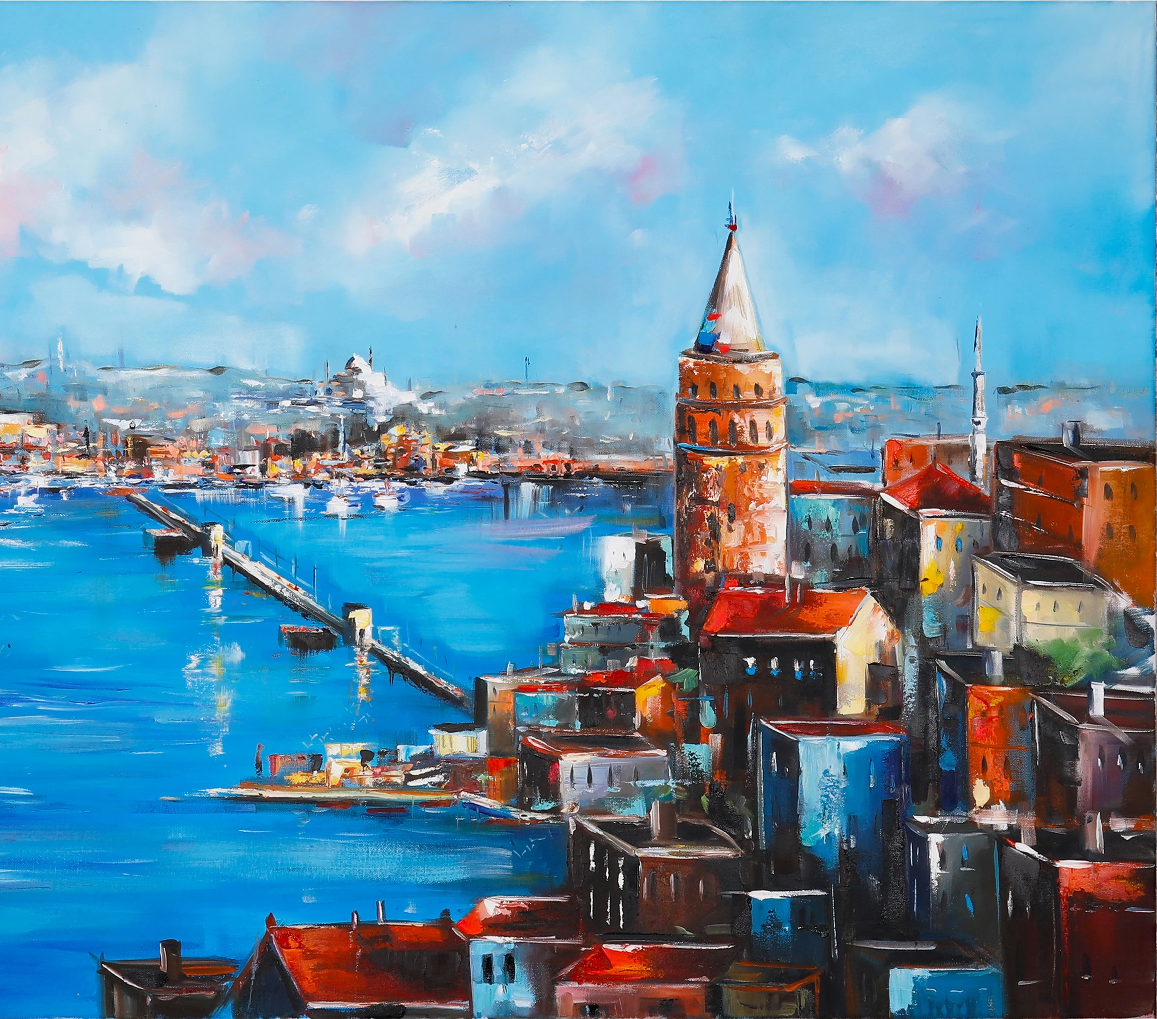 Çoğu kişiye göre dünyanın en güzel şehirlerinden biri olarak kabul edilen ve uzun ve zengin bir tarihe sahip İstanbul şehrinin ikonik sembollerinin şık bir tasvirini yapan "Mavi Galata" kanvas tablosu, mavi tonların ağırlıkta olduğu canlı renkleri ve enerjik tasarımıyla İstanbul'un benzersiz güzelliğini sergiliyor. Tarihi Yarımada manzaralı bu İstanbul temalı tablo tuval üzerine yağlıboya yapılmış olup detaylara gösterilen özenin, herkes tarafından takdir edilmesi adına ustalıkla hazırlanmıştır. Bu muhteşem panoramik İstanbul manzarası, şehrin kendisi gibi canlı maviler ve sıcak tonlardan oluşan hoş bir renk paletine sahiptir. İstanbul tablosu, her odaya güzellik ve kültür dokunuşu katacak etkileyici bir sanat eseridir.