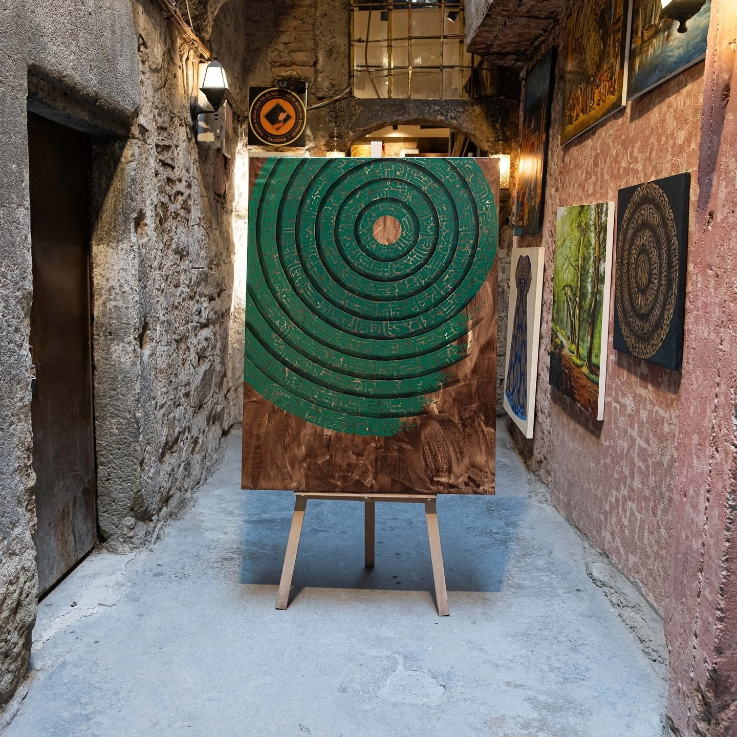 Our artwork is written with acrylic paint on canvas, combining original calligraphy and modern art. In our artwork, Ayetel Kürsi, Surah Ihlas and Surah Qalam verses 51-52 were written with modern calligraphic writing with our special design and pattern.