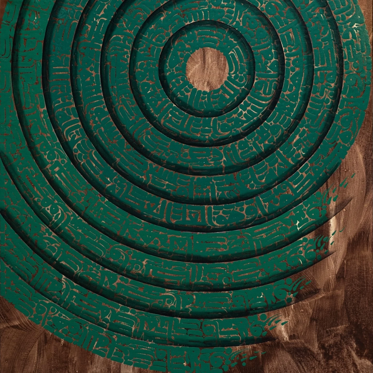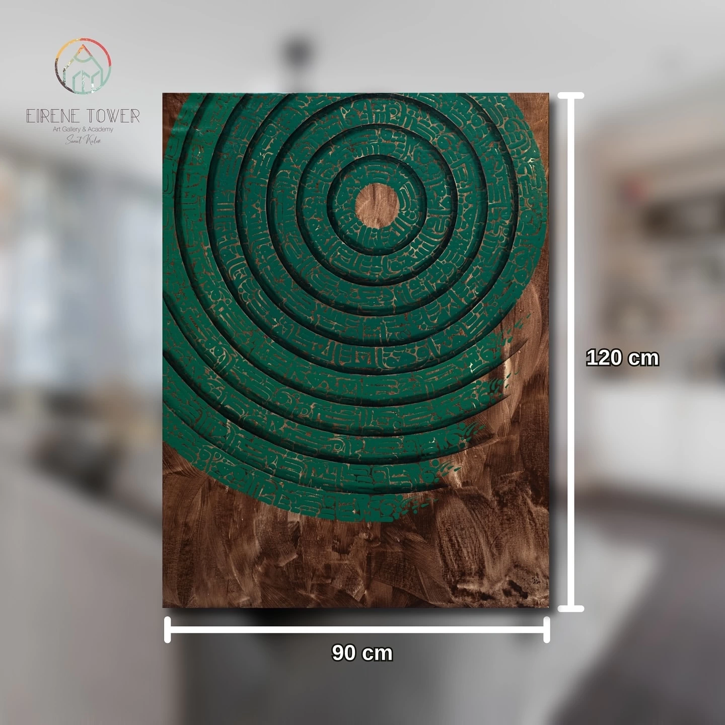 Sanat eserimiz orijinal kaligrafi ve modern sanatın birleşimiyle tuval üzerine akrilik boya ile yazılmıştır. Eserimizde özel tasarımımız ve paternimizle modern kaligrafik yazıyla Ayetel Kürsi, İhlas suresi ve Kalem suresi 51-52. ayet yazılmıştır.