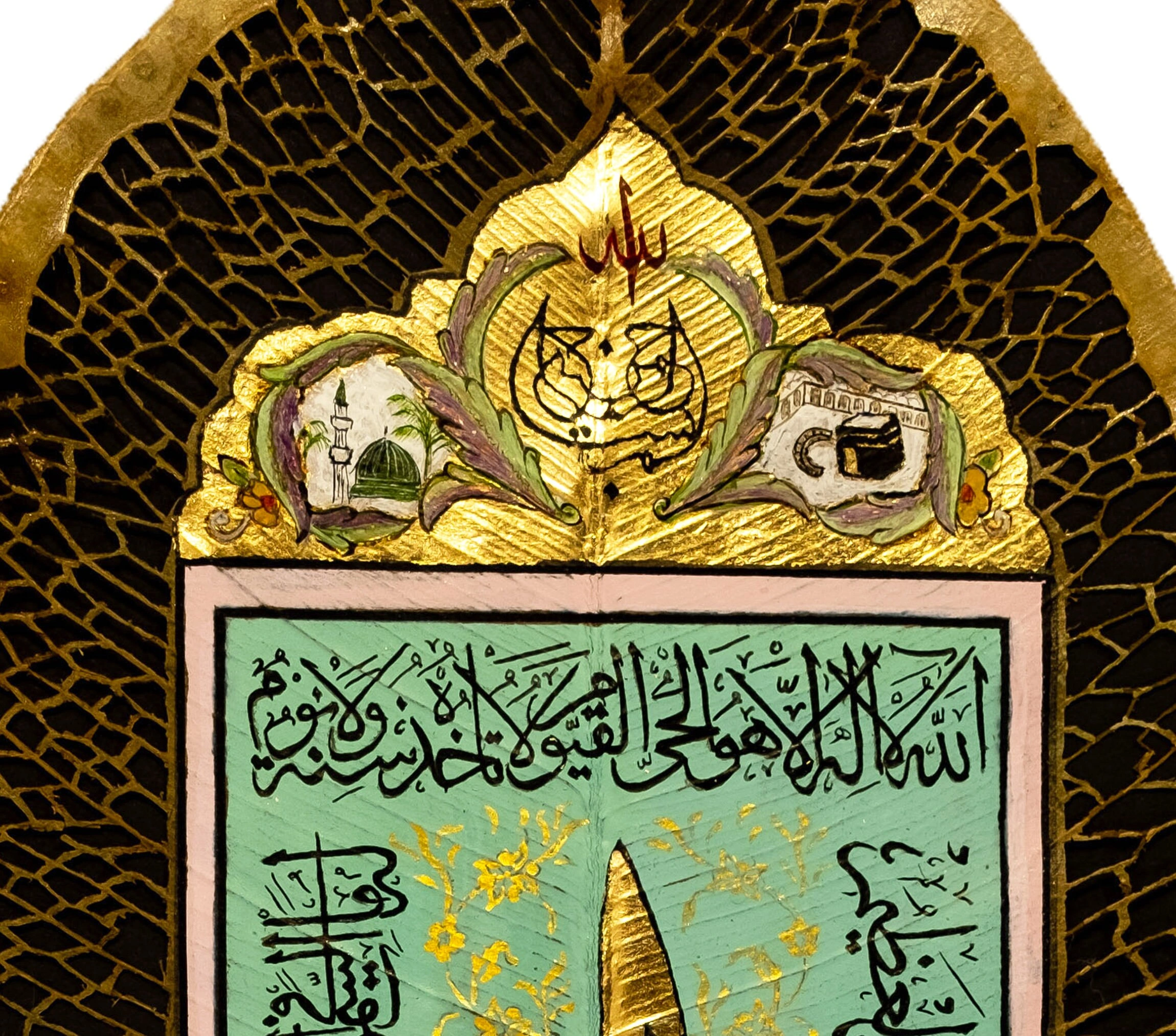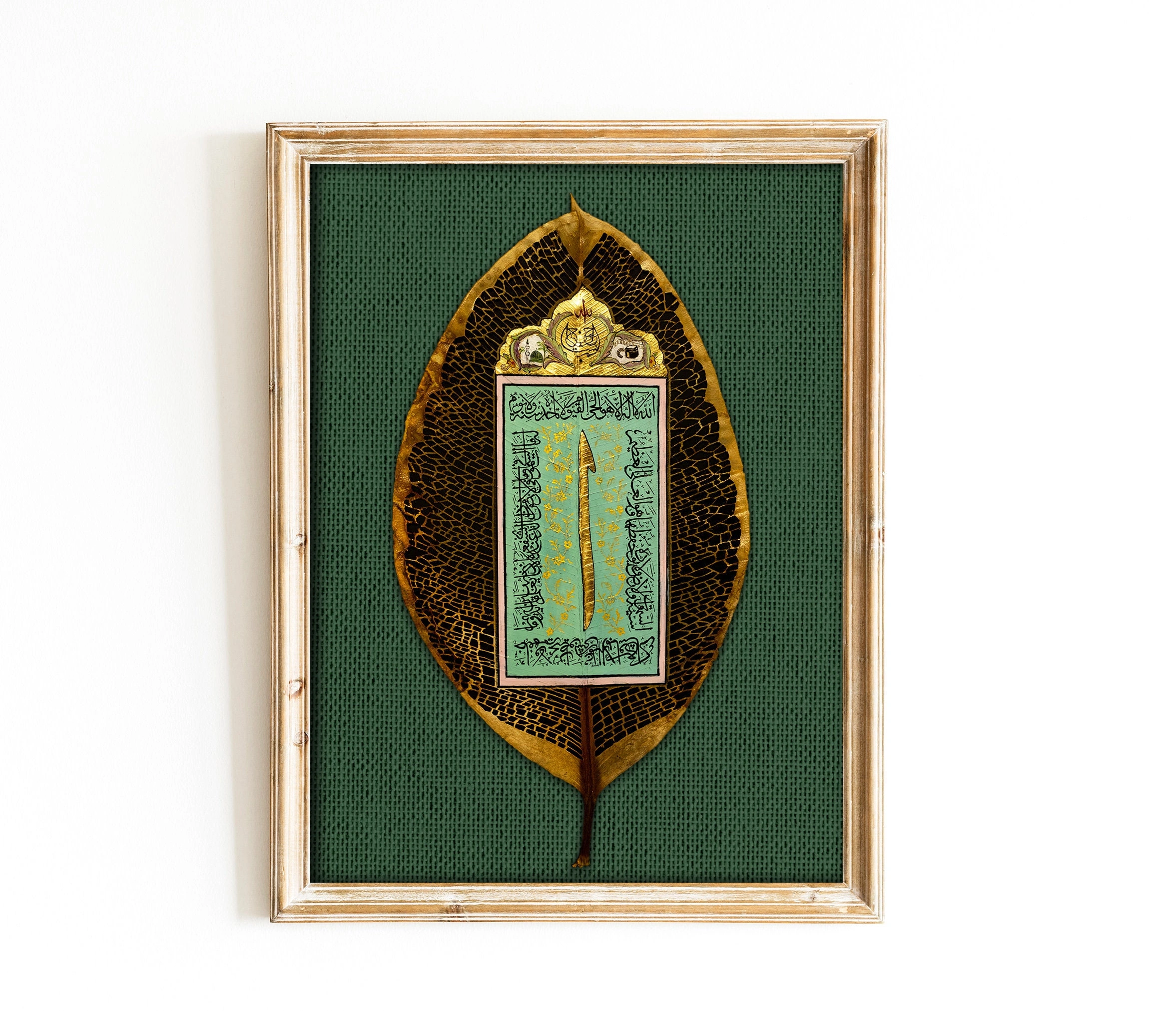 Gerçek kauçuk yaprağı üzerine yeşil tonlarıyla ve göz alıcı altın ışıltılı dokunuşlarla süslü el yazması Elif tezhip sanatı, her eve ilahi ve benzersiz hisler eklemek için mükemmel seçimdir. Ustalıklı yapılmış tezhip süslemeleri ve birbiriyle uyumlu renkleriyle bu sofistike İslami ev dekoru, her odada kendinden konuşturacak. Özenle yapılmış bu İslami tezhip eseri, onu gören herkesin dikkatini çekecek desenlere sahiptir. Şık motiflerin ve İslami hat sanatının dengeli karışımı her dekor stiline modern bir dokunuş katıyor. Elif yaprak sanatı, yeşilin en hoş tonları ve altın varak kullanılarak elde boyanmış tanıdık bir tasarıma sahiptir. Arapça kaligrafiyle süslü bu tezhip sanatı, ambiyansınızda bir konuşma başlatıcı olacak benzersiz ve özel bir parçadır. Zamansız ve modern bir duvar dekoru arayanlar için mükemmel seçim olan bu duvar sanatı sadece güzel ve zarif değil, aynı zamanda anlamlı ve ruhani bir mesajı da taşıyor.
