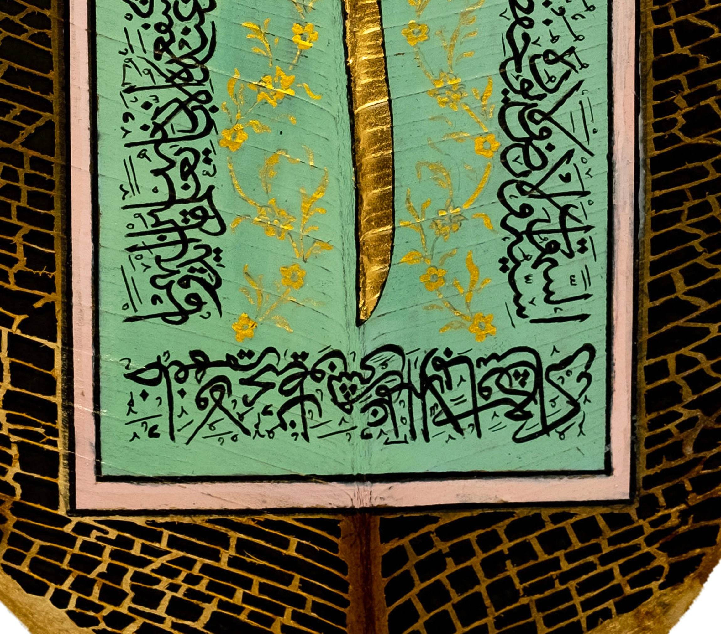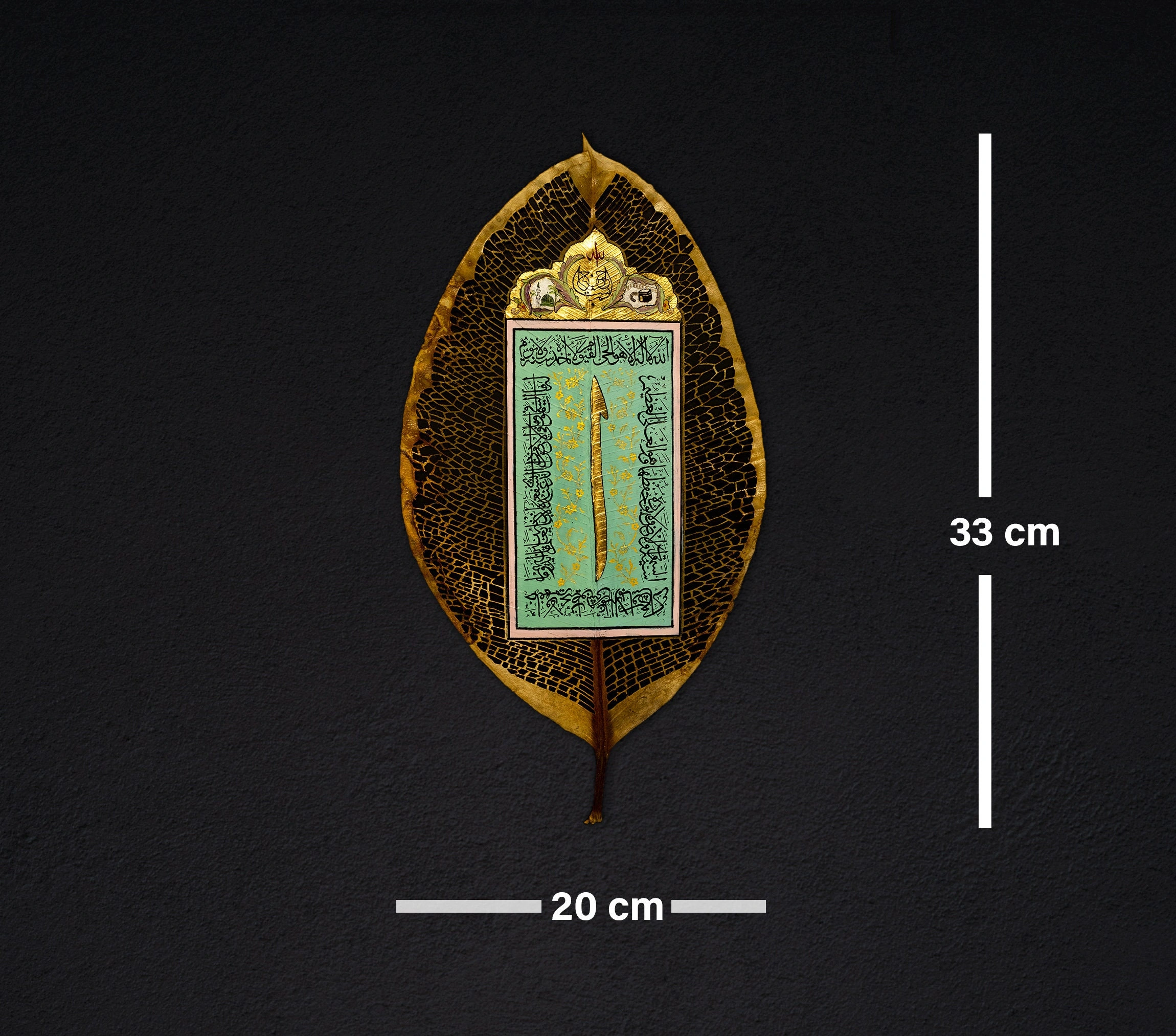 • Elif Vav Yaprak Oyma Sanatı Kauçuk Ağacı Yaprağı Üzerine Tezhip Süslemeli El Yazması Elif Vav Ficus Elastica Ev Dekoru